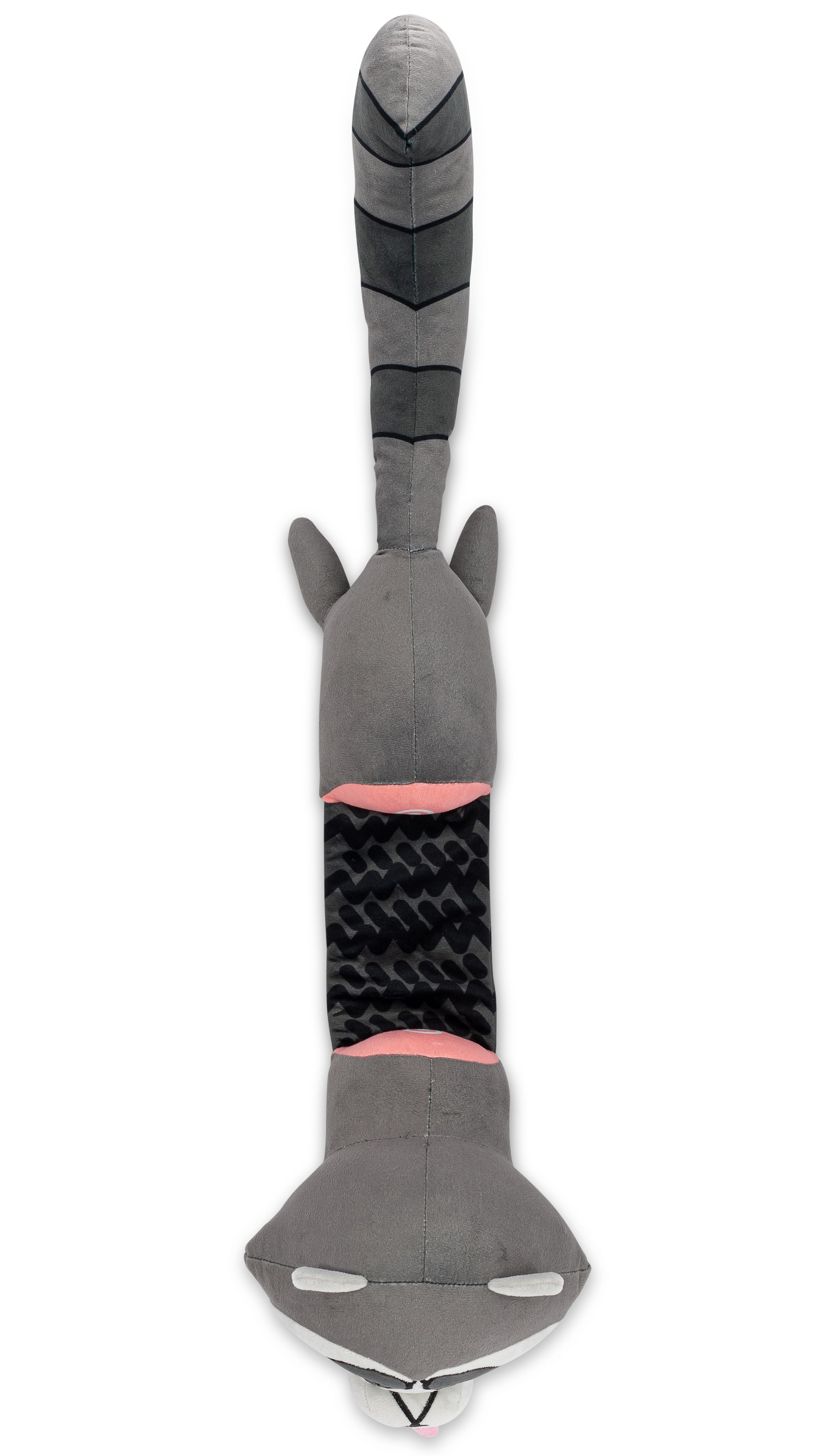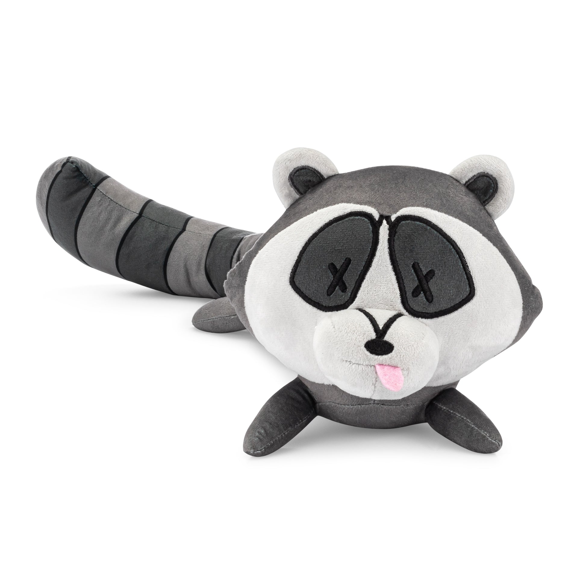 Roadkill raccoon measures at two feet long from head to tail and is made of soft velboa fabric and is filled with premium polyfill.
